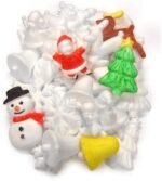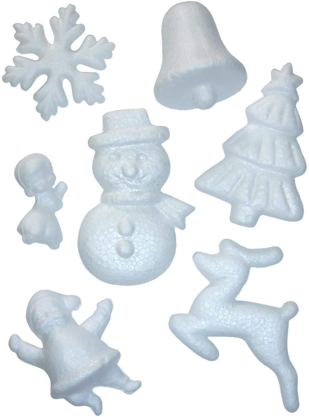 Set of 35 Christmas themed polystyrene shapes, with approximate lengths 5cm – 9cm. Can be glued or painted – ideal for use as Christmas decorations. Set contains 5 each of 7 different shapes: snowflake, bell, angel, snowman, Christmas tree, Santa Claus, reindeer.